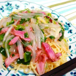 中華野菜麺類、そば、うどん肉大根と焼き豚のあんかけ焼きそば